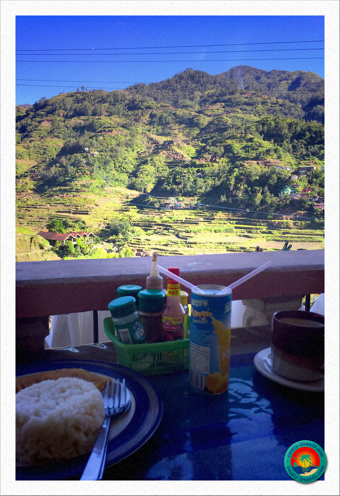 Am nächsten Morgen gegen 7 Uhr kamen wir dann völlig übermüdet endlich in Banaue an. Zunächst hatten alle Reisenden in einem Restaurant im Zentrum Zeit in Ruhe zu frühstücken. Hier wurden einem direkt einige Trekkingtouren angeboten. Es war früh am morgen und die Sonne kam langsam raus. Beim Frühstück hatte man auch direkt schon einen tollen Ausblick auf die Reisterrassen. Es schien ein schöner Tag zu werden. Die letzten Tage hatte es viel geregnet hier und so wollten wir den sonnigen Tag gut nutzen und buchten direkt eine Trekkingtour in Batad, einem anderen kleinen Dorf mit sehr gut gepflegten und atemberaubenden Reisterrassen, über die man bei der Tour balancieren kann. Mehr zu unserem Trip nach Batad gibt es hier. Vorher ging es aber erstmal zu unserem Homestay…