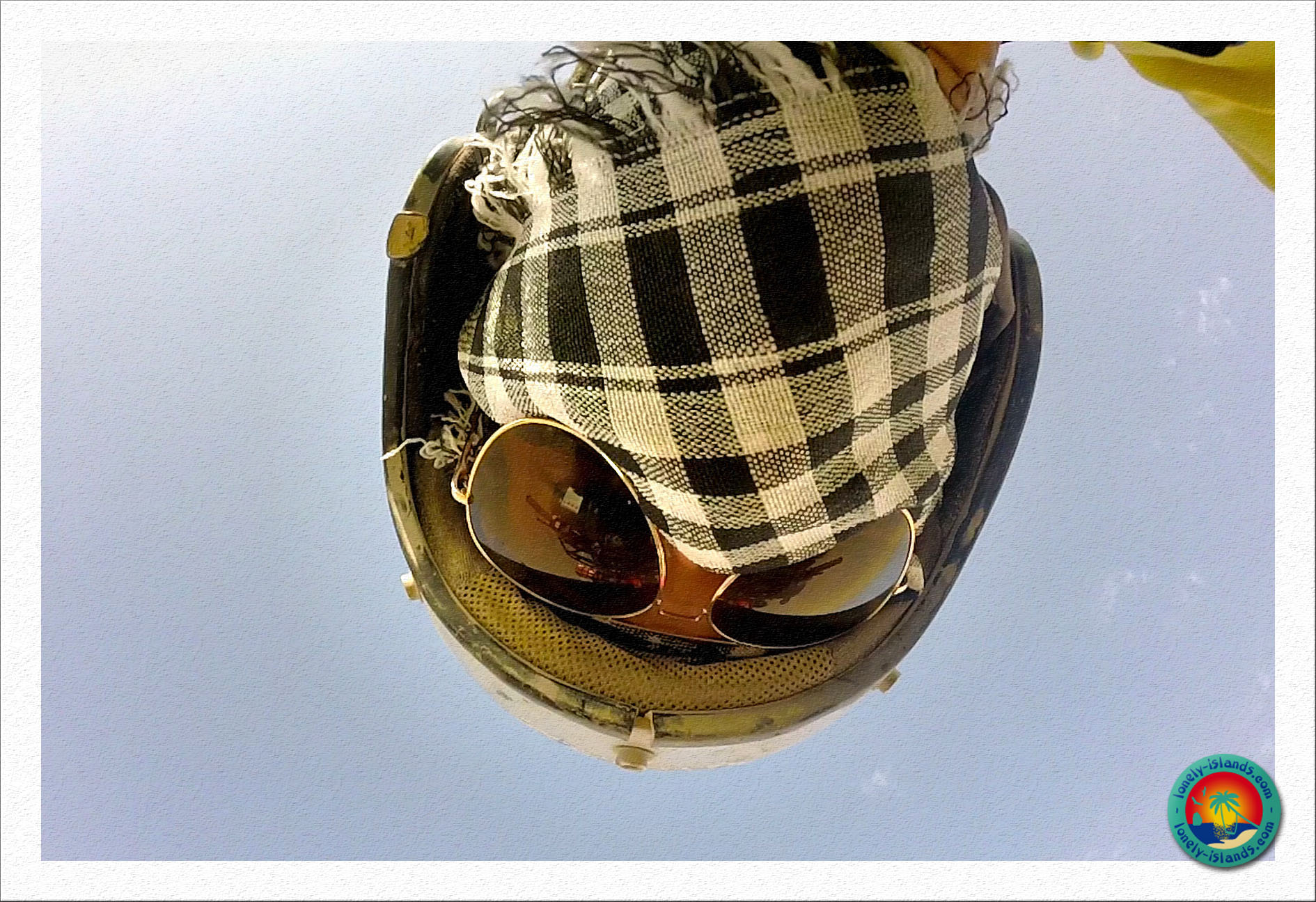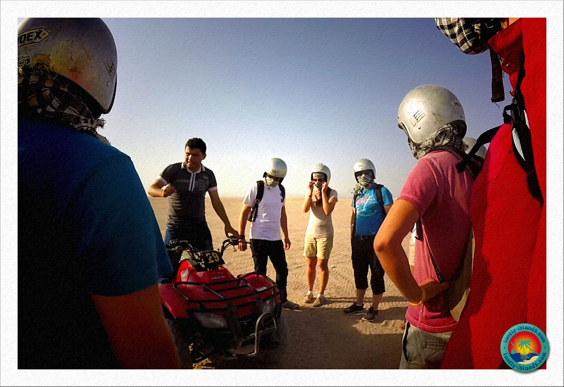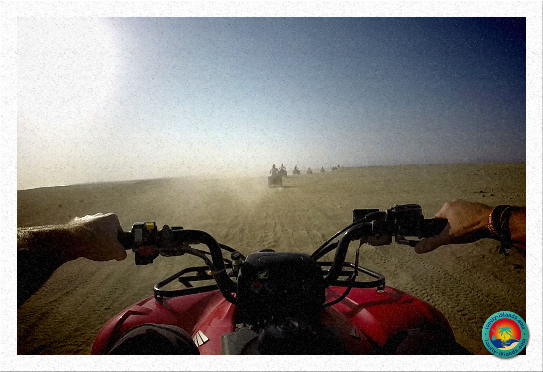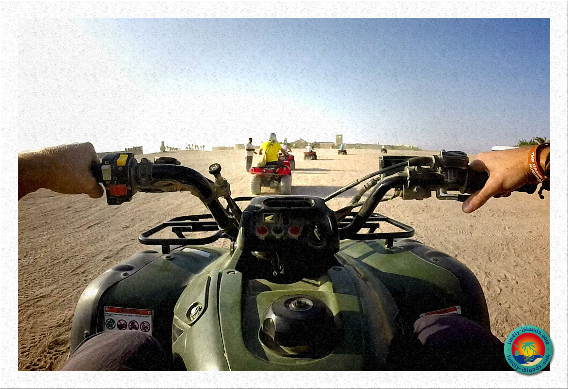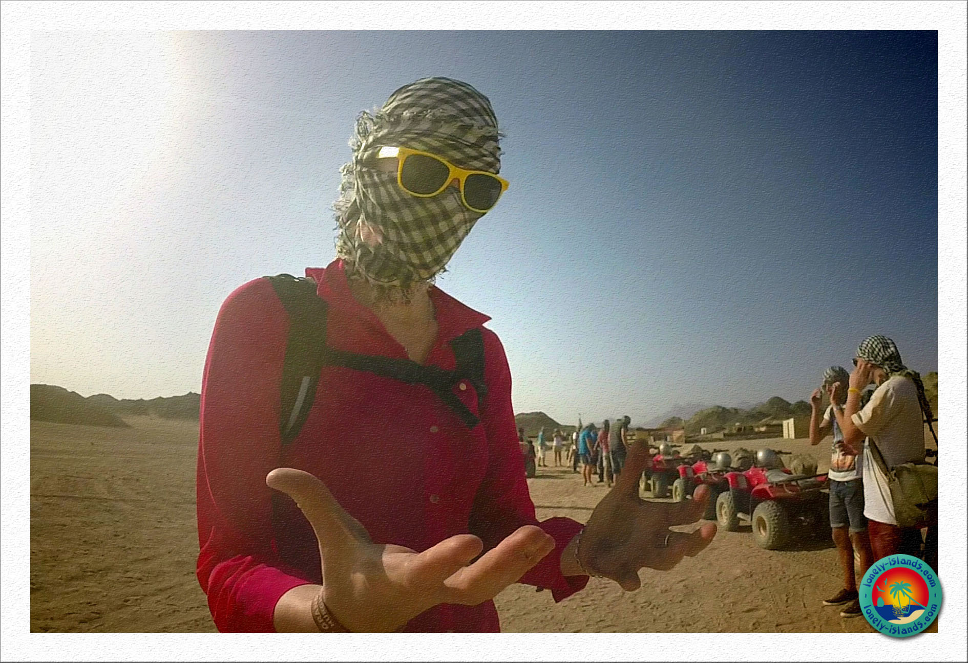 Nach ein paar Tagen Tauchen ging es dann aber doch noch ab in die Wüste. Für 35€ pro Person haben wir in der Hotellobby eine Quad-Tour zu einem Nomadendorf (Beduinendorf) gebucht. Wir wurden am nächsten Morgen mit einem großen Reisebus direkt vor dem Hotel abgeholt. Am Ausgangspunkt wurde man mit einem Wüstentuch vermummt und man konnte sich noch eine Schutzbrille leihen. Dann durfte man auf die Quads. Nach einer kurzen Einweisung ging es dann los Richtung Wüstenberge. Die Fahrt dauert ca. 30–45 Minuten bis man im sogenannten Beduinendorf ankommt. Hier warten die Nomaden (die meiner Meinung nach Schausteller waren) schon mit den Kamelen zum Reiten. Der Ritt ist im Vergleich zum Elephant-Trekking eher unangenehm und sehr kurz (ca. 2 Minuten). Danach wurde man zu einer Hütte gebracht in der man Beduinentee bekam und einem die verschiedenen “heilenden” Kräuter vorgestellt und zum Kauf angeboten wurden. Es wirkte alles sehr künstlich und nicht wirklich traditionell, da auch ein Kiosk mit kalten Getränken im Dorf war und die “Nomaden” alle mit Ihren Handys beschäftigt waren 😂.