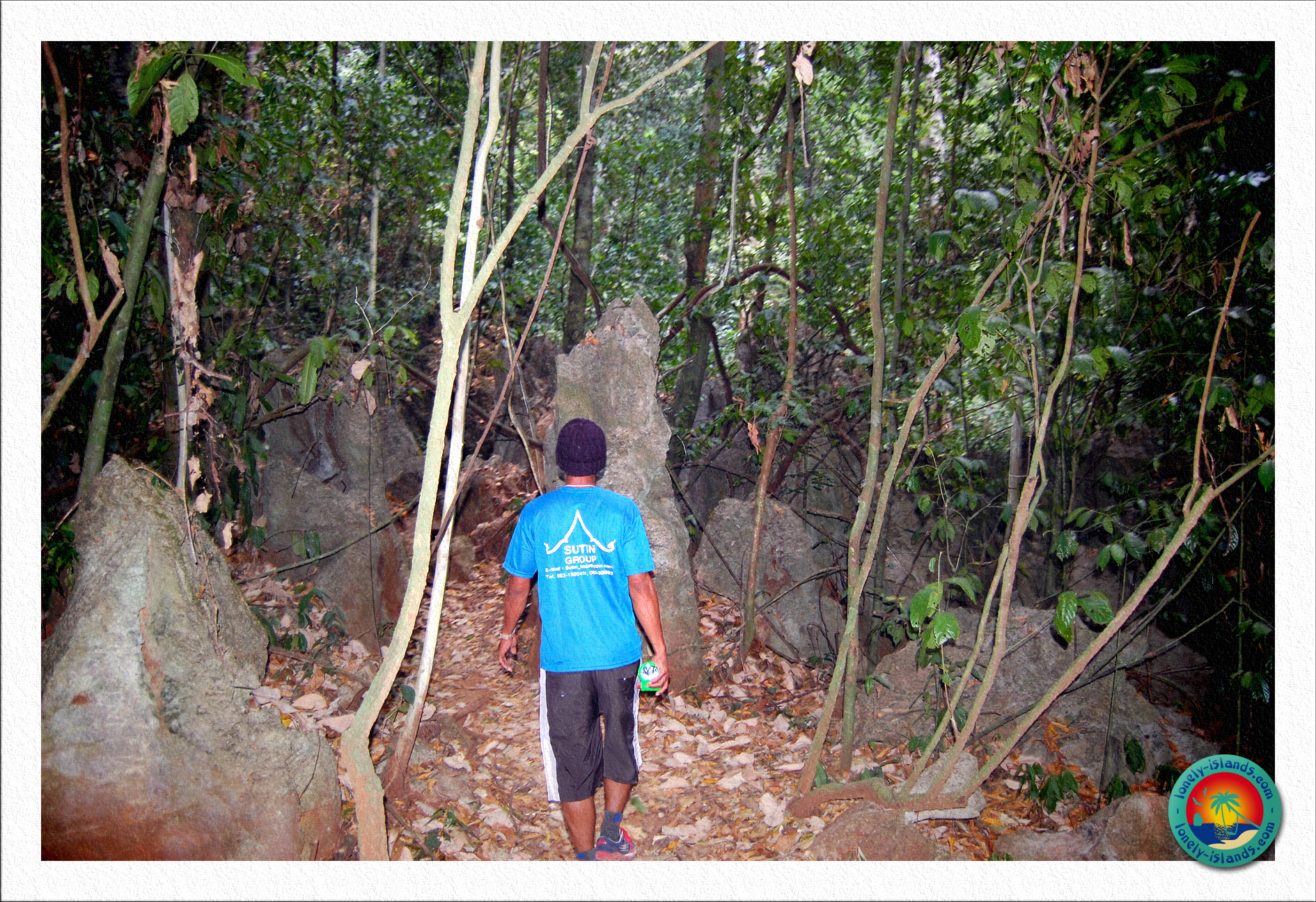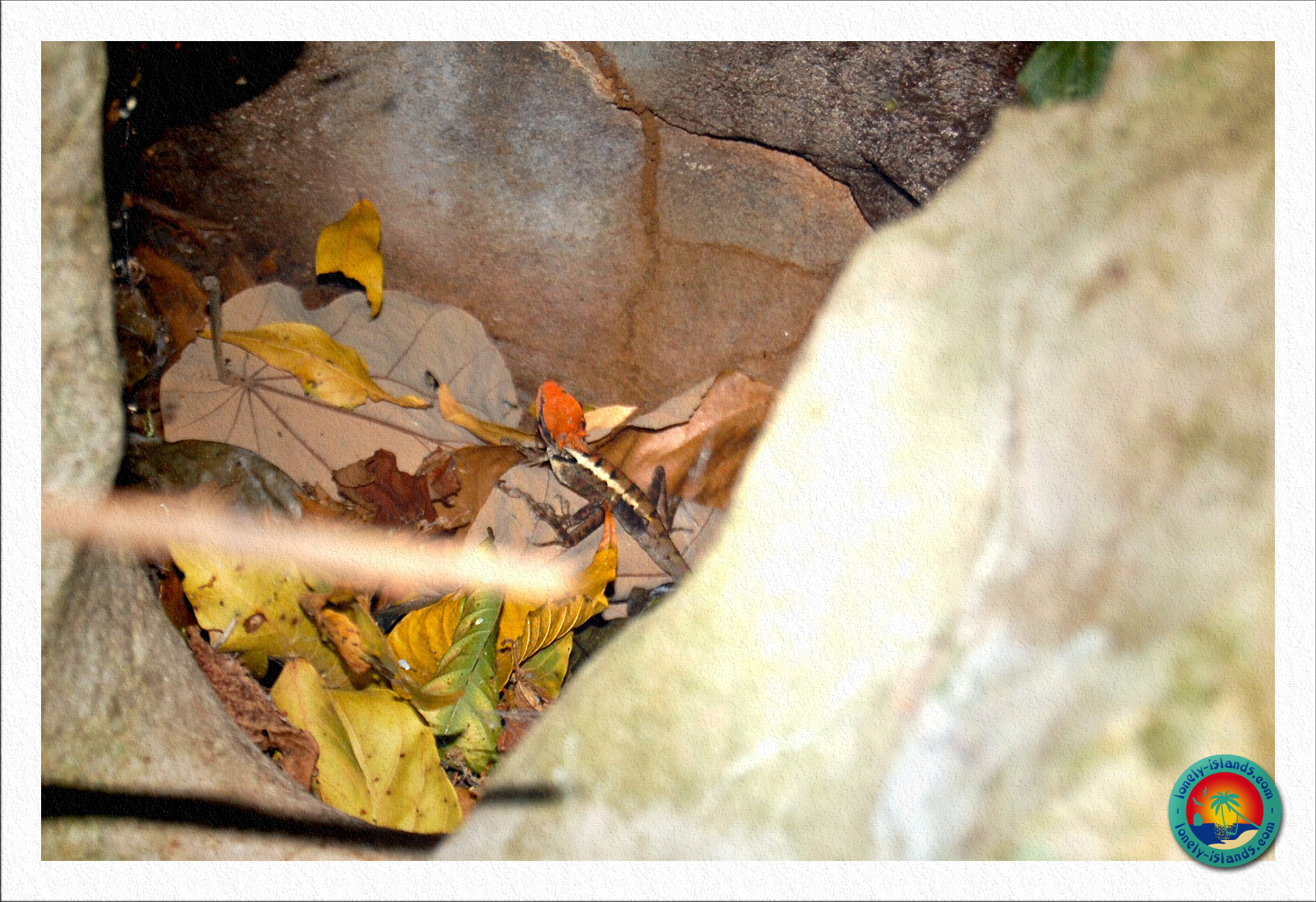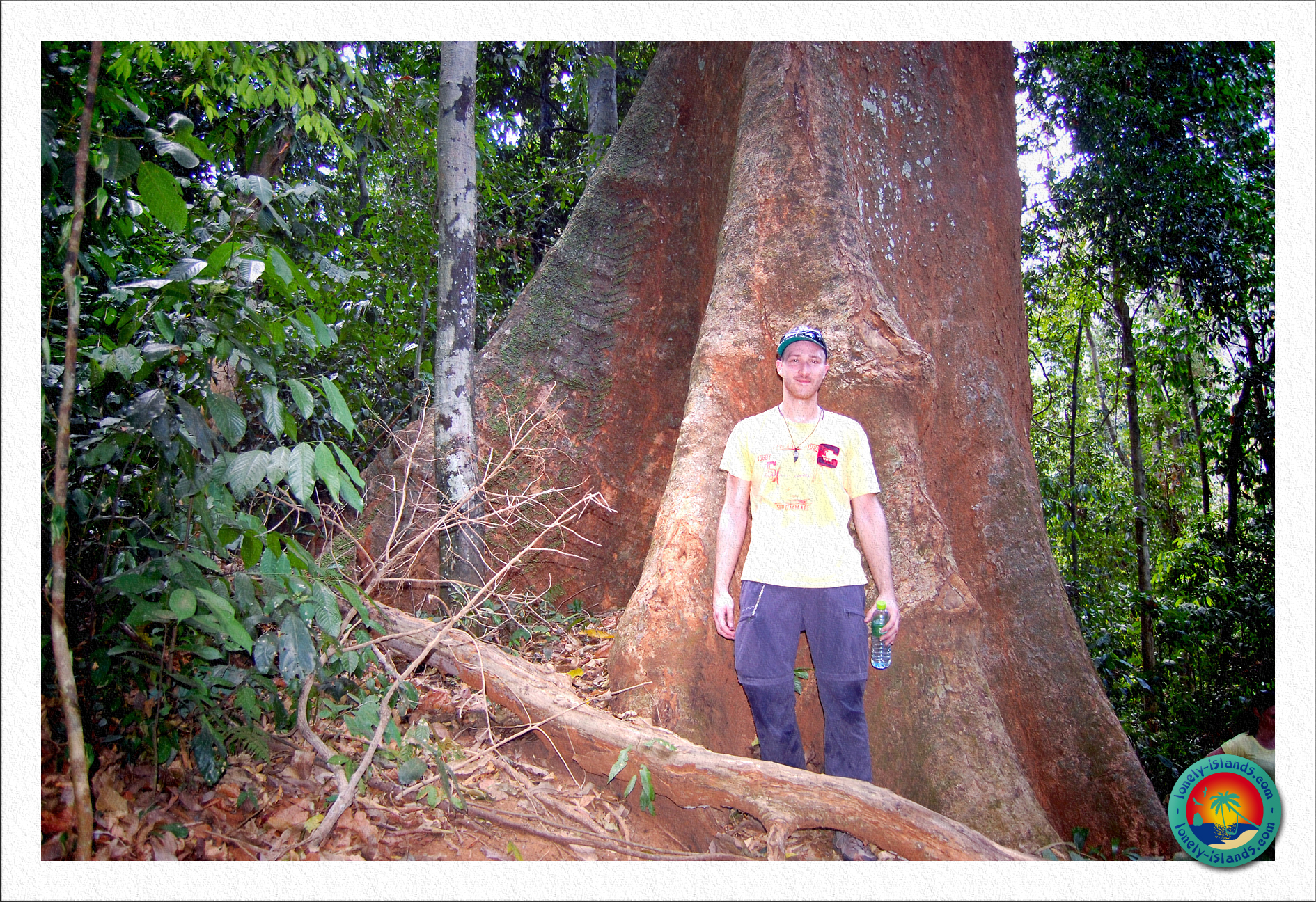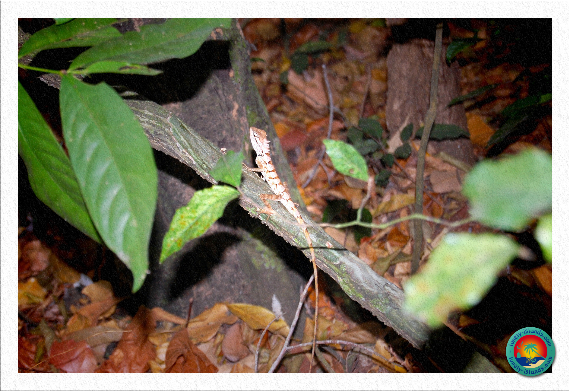 Als wir den Startpunkt für die Wanderung erreicht haben, war endlich Action angesagt. Jeder hat noch eine Flasche Wasser bekommen, um nicht zu dehydrieren, und dann ging es los. Und der Dschungelpfad war nicht ohne. Es gab viele Steigungen und ging über spitze Felsformationen an Wurzeln und Abhängen vorbei. Vorsicht und feste Schuhe waren also angesagt. In den Waldgebieten des Nationalparks soll es sogar Tiger, Leoparden und einige Elefanten geben. Aber wohl nur nördlicher in den tieferen Wäldern. Wir haben viele riesige Mammutbäume, eine Eichhörnchenart, viele bunte, große Schmetterlinge, Termitenhügel und sehr viele verschiedene Echsenarten entdeckt.