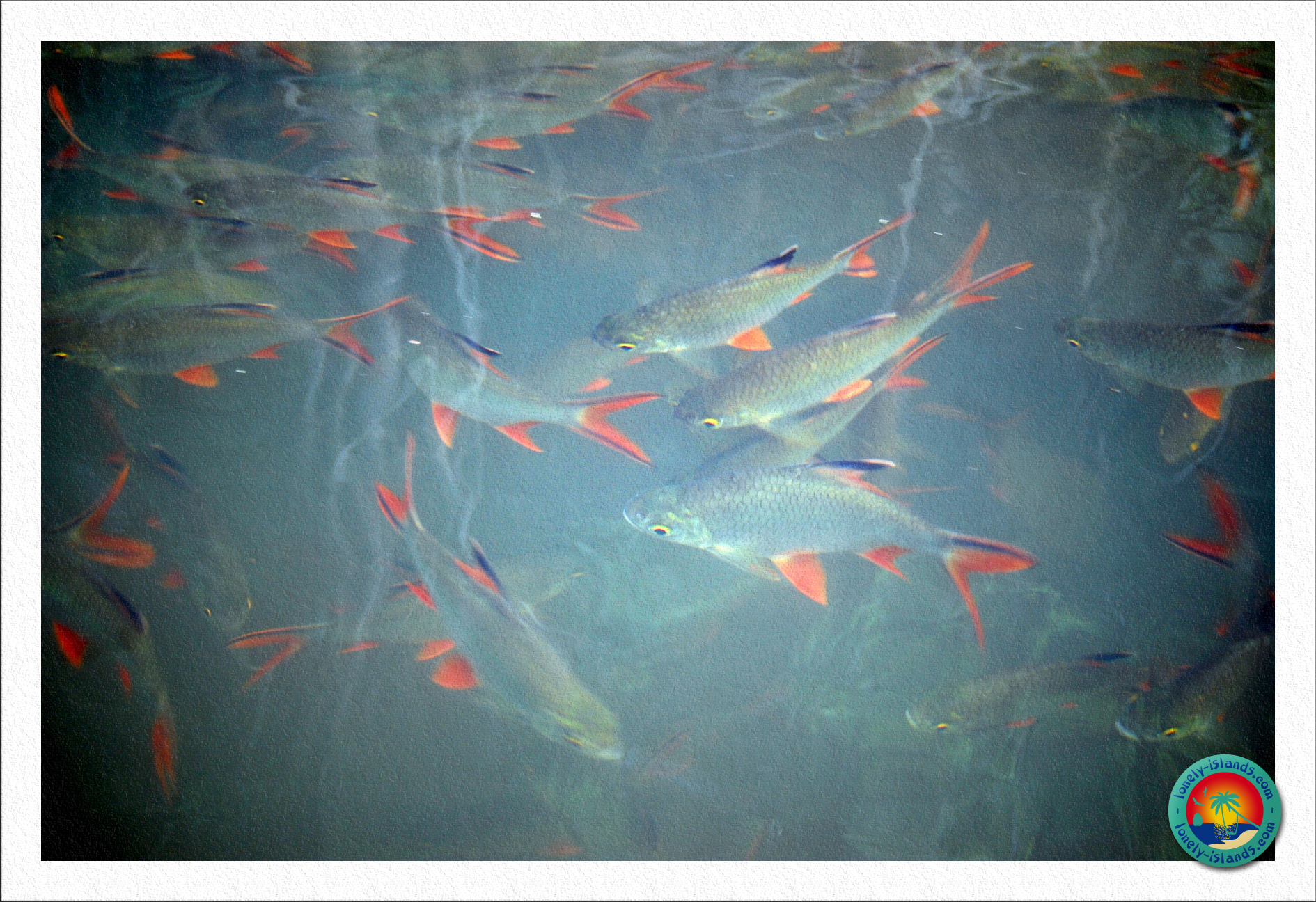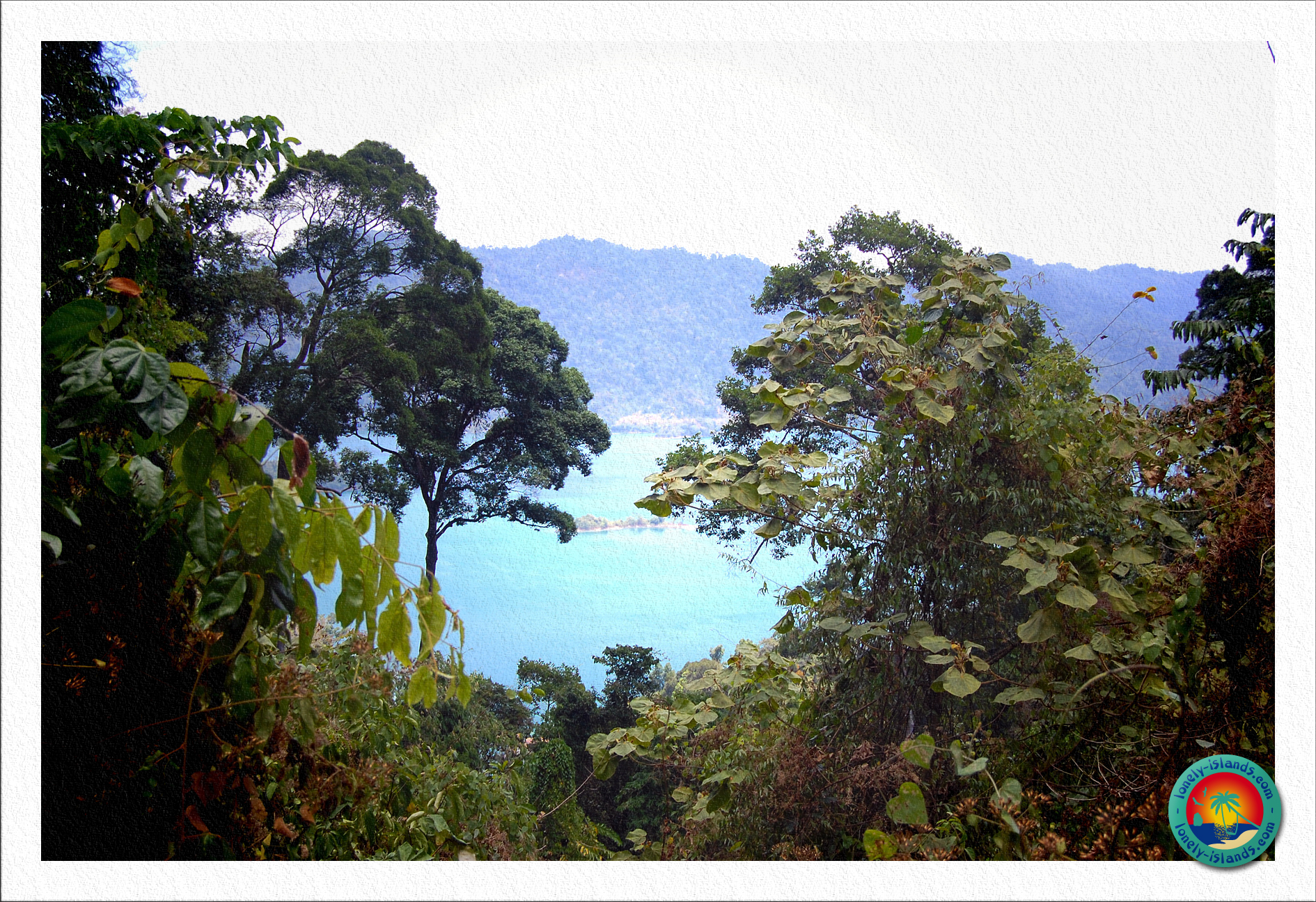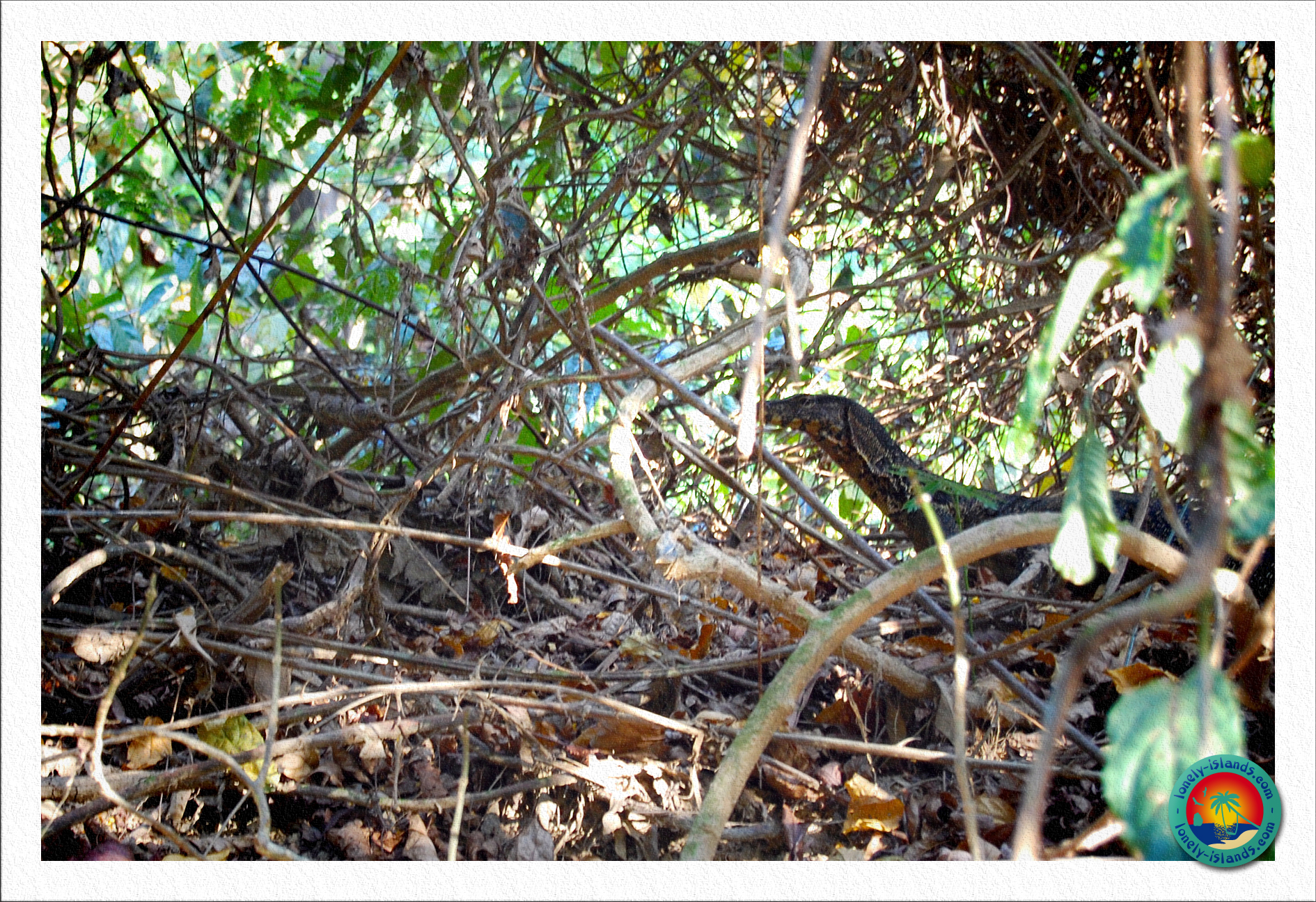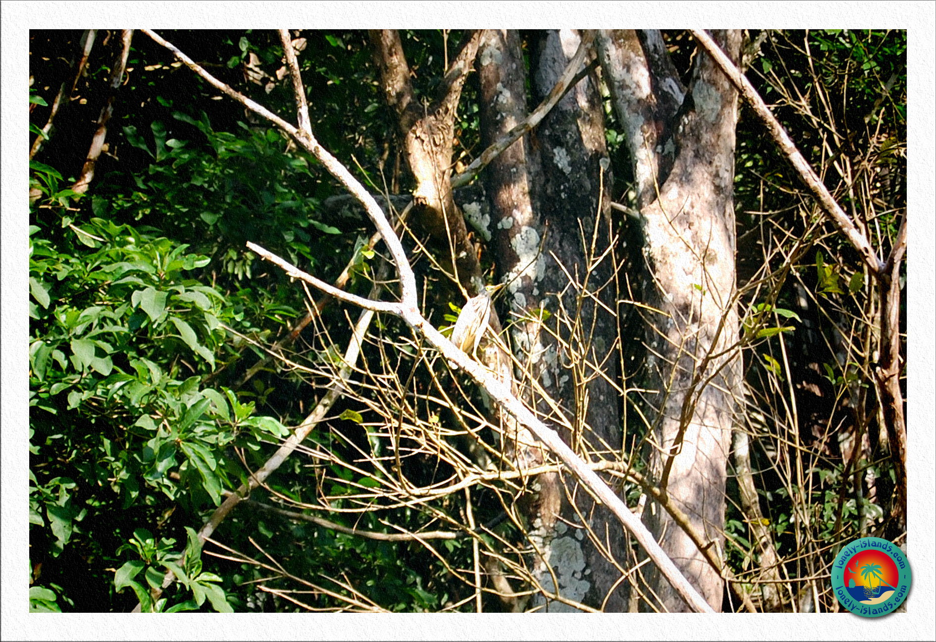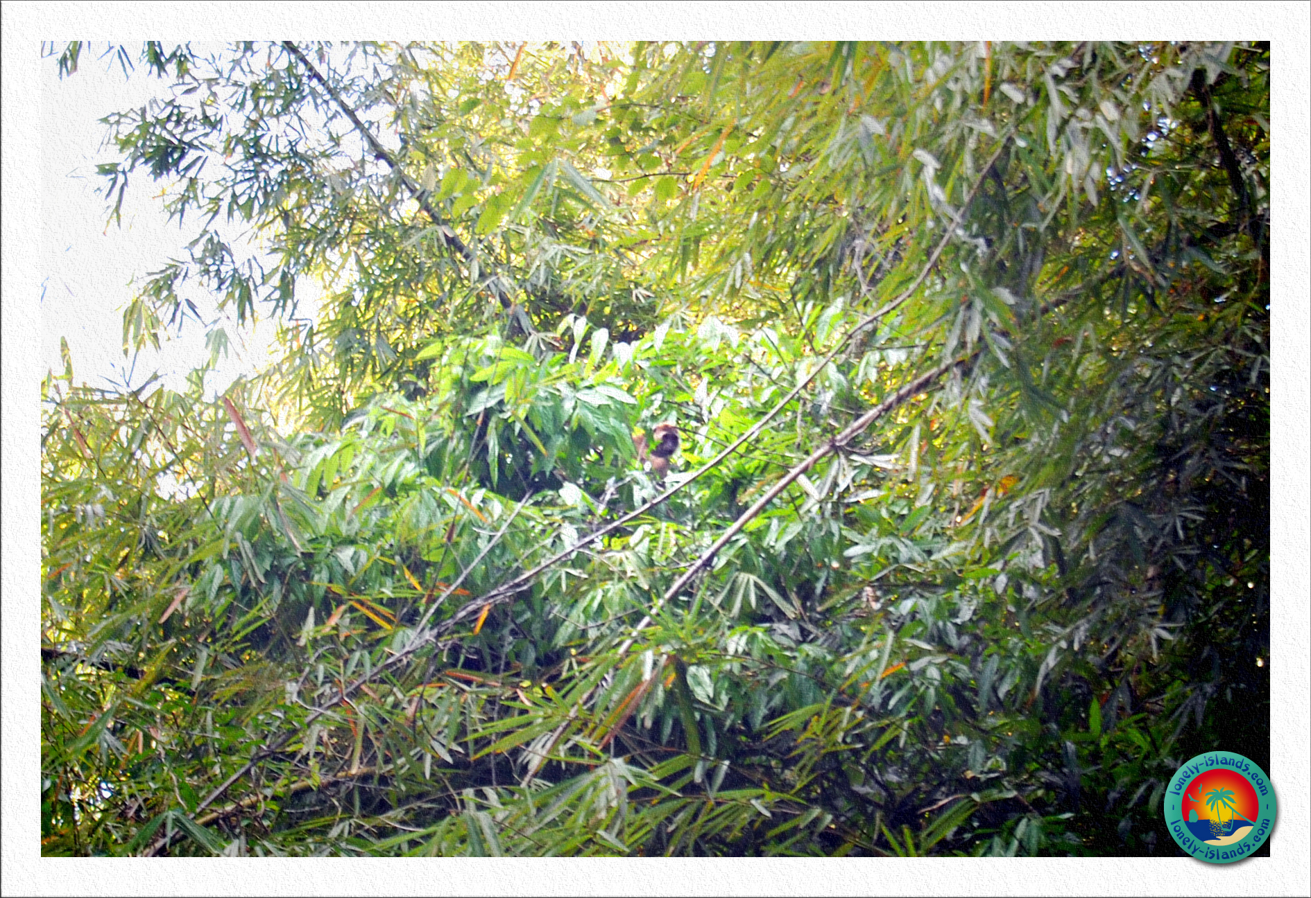 Dann ging es los zum direkt angelegenen Fluss. Eine Kanutour war angesagt. Und das auch noch mit privatem Bootschauffeur. Also hieß es entspannen und die Natur genießen. Der Fluss war allerdings aufgrund der Trockenzeit sehr flach und stellenweise sind wir ausgestiegen, um unserem Guide die Arbeit zu erleichtern. Trotz der Abgeschiedenheit war es hier sehr laut. Käfer, Affen, Heuschrecken, Frösche und Vögel gaben wirklich alles. Außerdem wurden uns viele Tiere gezeigt, die schwer zu sehen waren. Einige Warane, Schlangen, Fische, Kormorane und Brillenlanguren. Auch hier konnte man eine wunderschöne Landschaft genießen. Interessante Dschungelgewächse wie z. B. Lianen, Farne, Mammutbäume und Bananenstauden umgeben von Bergen. An einer Stelle konnten wir schwimmen, da es hier tiefer war. Außerdem haben sie eine Leiter mit kleiner Plattform an einem Baum gebaut, von dem man sich aus ca. 4m Höhe mit einem Seil ins Wasser schwingen kann. Typisch Dschungelabenteuer halt!