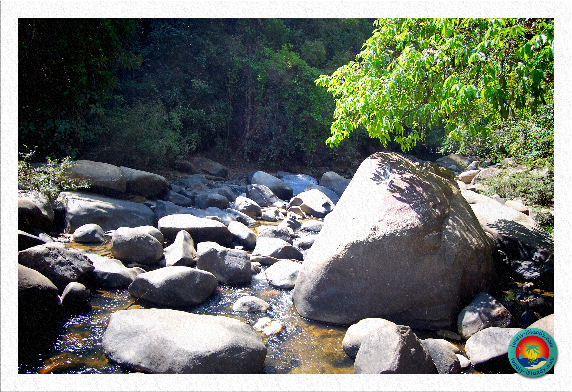 Am dritten Tag ging es ein letztes Mal auf zu einer Wanderung südlich des Chiau Lan Sees in der Nähe des Khao Sok Rivers. Hier waren die Pfade gut ausgebaut und nicht so gefährlich. Allerdings waren hier auch einige Touristen anzutreffen. Anstrengend war es trotzdem und der Schweiß fing wieder schnell an zu laufen. Bei Tom, unserem Guide, lief natürlich kein einziger Tropfen. Der Pfad führte vorbei an einer Trinkstelle für hier freilebende Elefanten. Allerdings war er wegen 2 Monaten ohne Regen ausgetrocknet. Wir gingen an riesigen Bambusbäumen vorbei und sahen Ingwerpflanzen. Außerdem wieder einige Arten an Echsen und schwarz-orangene Hornissen. Hier hingen auch die Lianen herunter, an denen man sich gut hin- und her schwingen konnte. Dann ging es abseits der Pfade zu einem Flusslauf, der zu einem Wasserfall führte. Hier mussten wir über viele Felsen springen und klettern. Hier kann ich nur feste Schuhe empfehlen! Ich hatte nur meine Sneakers an und bin auf einem Felsen weggerutscht und schon lag ich halb im Wasser. Dummerweise bin ich genau auf die Stelle gefallen, wo mein Handy in der Tasche war. Das Display ist gerissen und das Handy reagierte nicht mehr. Ich trocknete erstmal schnell alle Teile des Handys und nach ein paar Stunden lief es zum Glück wieder. Seit dem kann ich nur Trekkingschuhe empfehlen ;-). Laufschuhe gehen natürlich auch. Dem Flusslauf folgten wir noch über Felsen zu einem Wasserfall. Aber zu dieser Jahreszeit gibt es wohl nicht viele Wasserfälle, an denen viel Wasser fließt. So auch hier. Eher ein Wasserfällchen. Hier ging das Abenteuer der Dschungelsafari zu ende, an das ich lange zurück denken werde. Es ging ein letztes Mal zurück zu unserer Unterkunft an der wir noch einmal kulinarisch verwöhnt wurden.