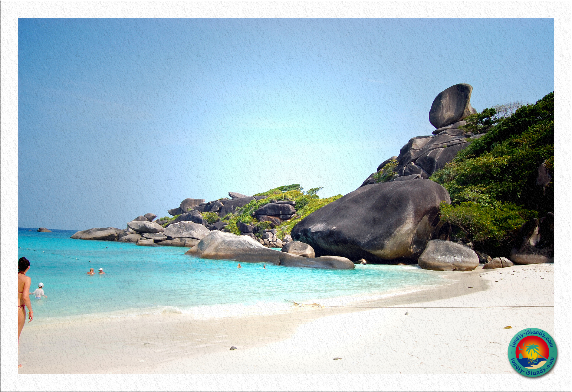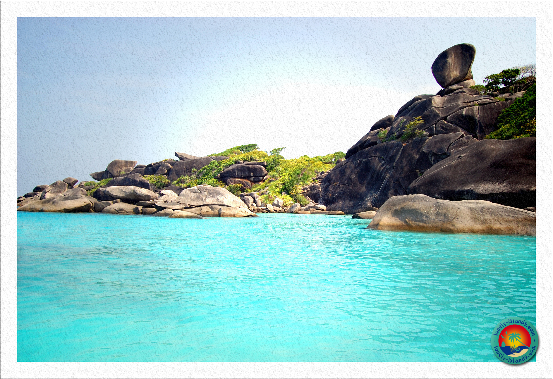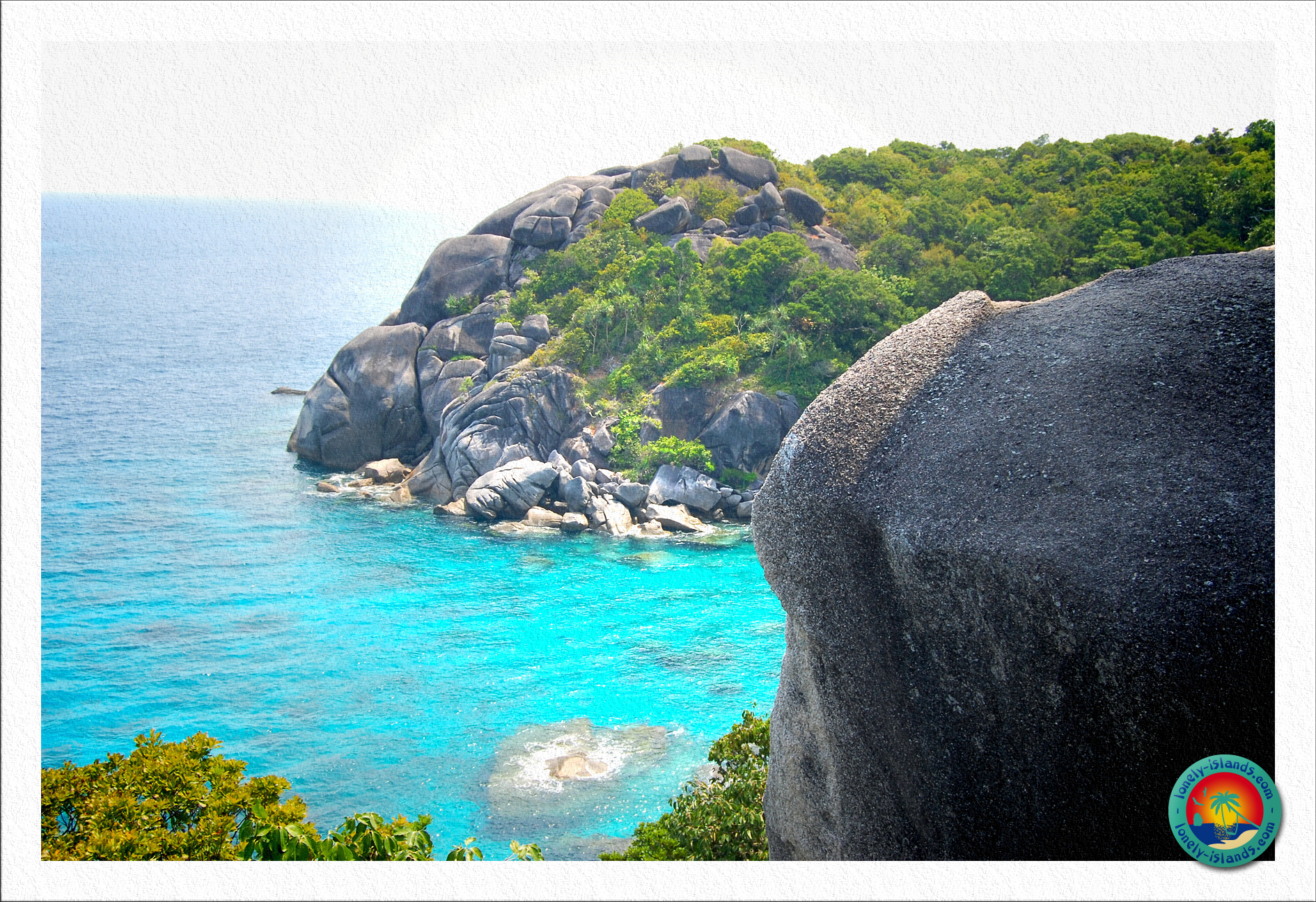 Nach ca. 30 min. Schnorchelzeit ging es dann zur ersten Insel. Es war die Insel, die man aus den Prospekten kennt. Die mit dem Entenkopffelsen oder Sailrock. Vor Ort sieht der Strand noch schöner aus. Total sauberer, feiner, weißer Sand und das Wasser leuchtete in schönen, unterschiedlichen Blautönen. Außerdem sind die Strände hier umgeben von Granitfelsen. So stelle ich mir das Paradies vor. Das einzige, das zu dem klischeehaften Paradies fehlt, sind Kokospalmen, von denen hier nur wenige zu sehen sind. Ansonsten kann es kaum schöner sein! Die Strände der Similan Islands erinnern aufgrund ihrer Granit-Felsen sehr an die Seychellen.