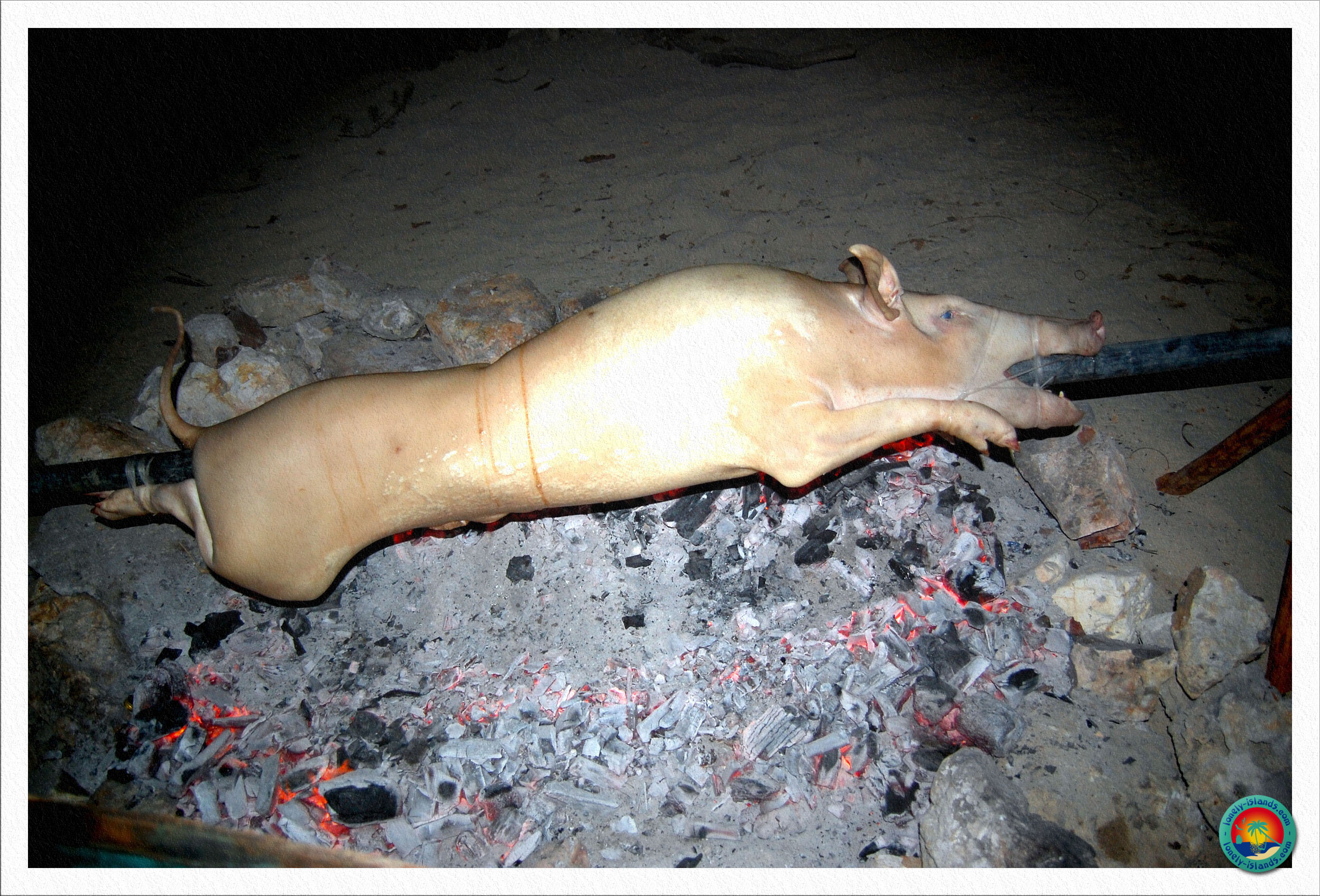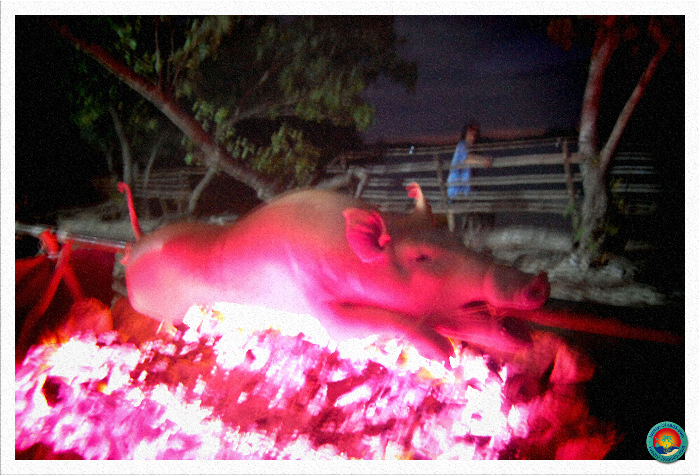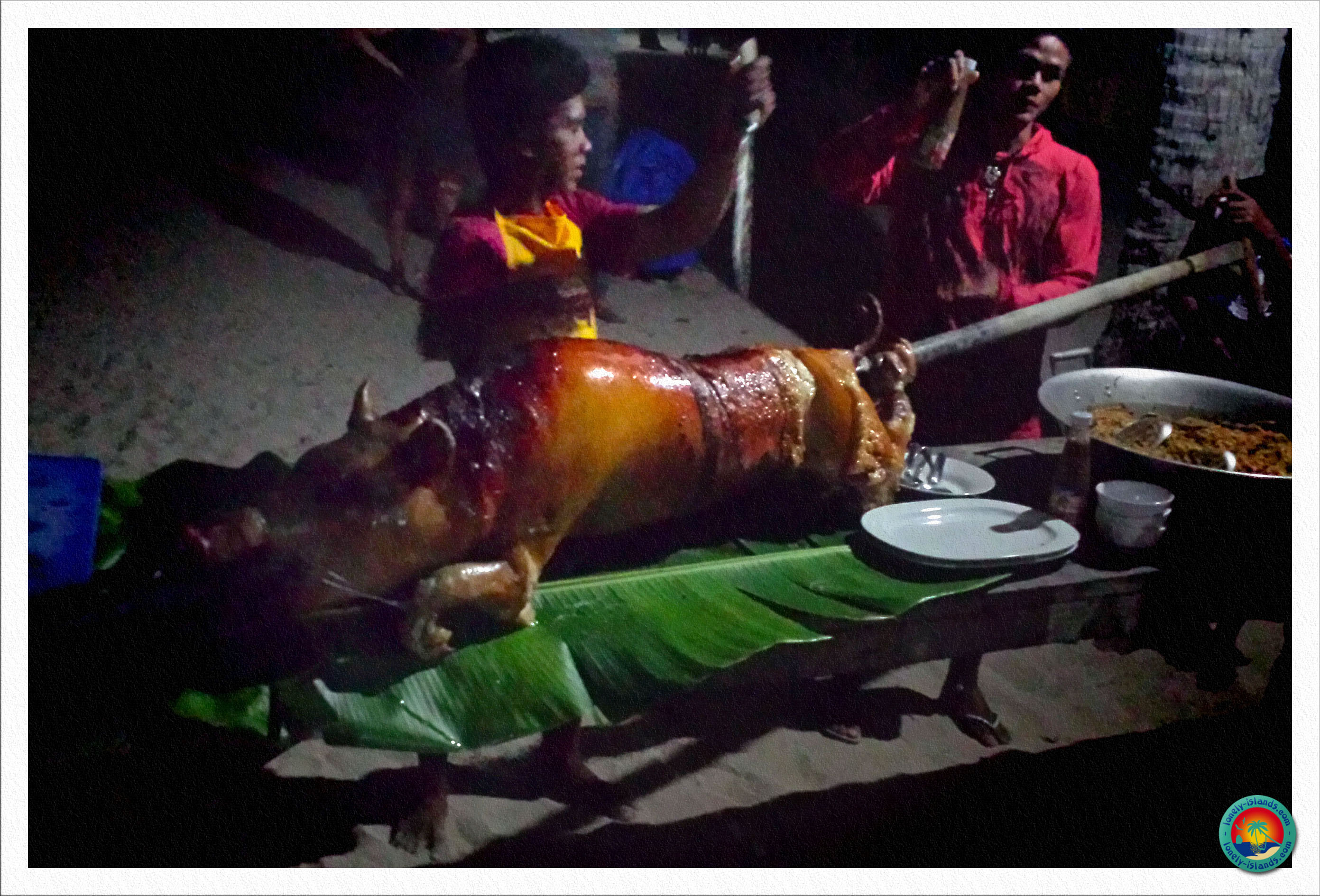 Bis zu den Seestraßen von Coron herrschte starker Seegang und es konnte einem schonmal übel werden. An Board war heute ein Schwein, dass zum Abschluss des Trips an Board geschlachtet wurde. Das laute Gequike dabei war nicht besonders schön mit anzuhören, aber es war schnell tot und mit Sicherheit humaner, als so manche Massentierhaltung bei uns. Spanferkel ist ein traditionelles Gericht auf den Philippinen und das sollten wir heute Abend genießen können. Unser letztes Basecamp hatte eine lange Sandbank und Mangroven. Da es hier meist bewölkt war, wirkte die Insel nicht ganz so paradiesisch wie die bisherigen Basecamps, aber bei gutem Wetter ist auch das hier eine wahre Trauminsel. Nachdem wir das sehr gut zubereitete Spanferkelessen genossen haben und mit unseren neuen Freunden ein paar Drinks hatten, bauten Dorfbewohner der Insel eine Karaokemaschine auf und wir wurden natürlich ermutigt mitzumachen. 😀